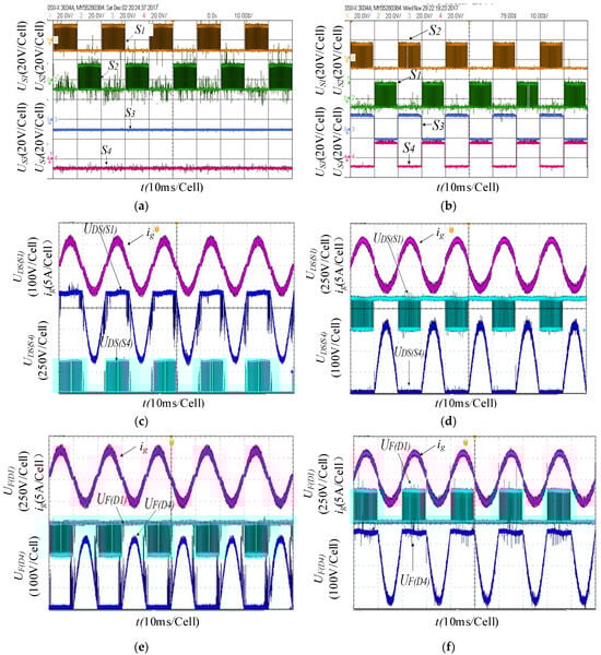 Rectifier/inverter grid-connected experiment steady state waveforms. (a,b) Driving waveforms of switchers; (c,d) withstand-voltage waveforms of the S1 and S4; (e,f) corresponding D1 and D4 withstand-voltage waveforms.