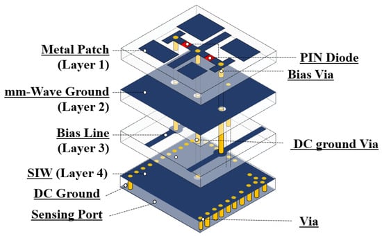 Figure 1 shows the 3D view of the proposed unit cell. As shown in Figure 1, the unit cell has a total of four layers. An Isola I-TeraMT(R) substrate with a permittivity of 3.45, a loss tangent of 0.0031, and a height of 0.78 mm was used for our proposed unit cell. The size of the unit cell at 29 GHz was 0.48λ0 in terms of wavelength. On the top layer, there was the metallic pattern for the nearly 2-bit operation with two PIN diodes. The top of the second layer was the mmWave ground, and a metallic layer was created at the top of the second layer for mmWave grounding operations. To bias the two PIN diodes, biasing lines are required. There were two PIN diodes used to obtain 2-bit operations. On the top of the third layer, biasing lines were designed. The biasing lines had no significant effect on the overall performance of the unit cell. A SIW structure was conceived for the sensing operations at the bottom of the unit cell.