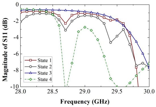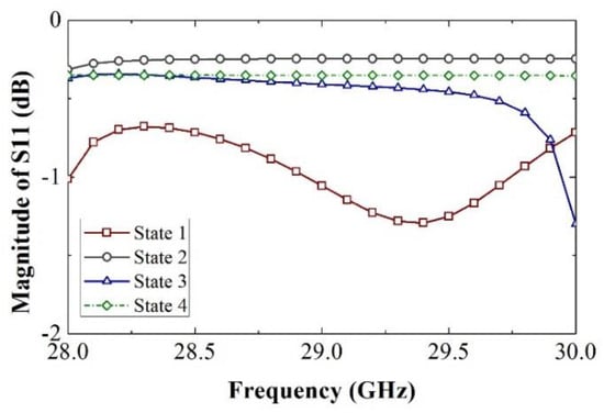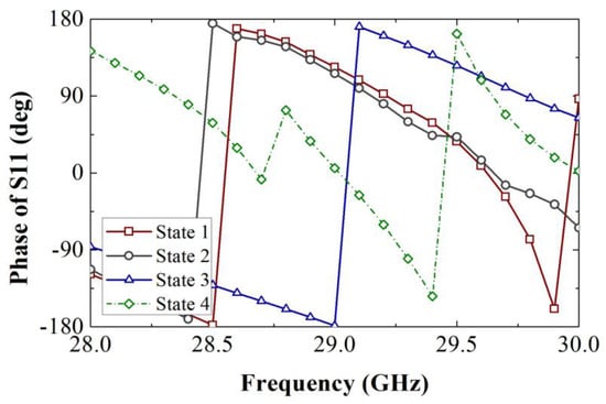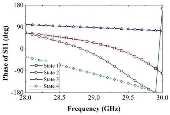 The typical forward bias resistance of the said diode was 5.2 Ω, and the typical total capacitance in the reverse bias condition was 0.025 pF. When the PIN diode is in the forward bias, it can be represented as a series inductance and resistor. Conversely, in the reverse bias condition, it can be modeled as a parallel resistor and capacitor with an inductor connected in a serial configuration. The dimensions of the proposed unit cell were 5 mm × 5 mm, which was smaller than the free space wavelength in the 29 GHz frequency band, ensuring the avoidance of grating lobes. The electric field distributions of the top patch of the unit cell are depicted in Figure 5a–d for State 1, State 2, State 3, and State 4, respectively. State 1, State 2, State 3, and State 4 are different biasing conditions of the PIN diodes in our design. Figure 6 shows the magnitude of the reflection coefficient for different states. We optimized our design at 29 GHz. At 29 GHz, the magnitudes of the reflection coefficients were −1.0 dB, −0.24 dB, −0.4 dB, and −0.35 dB, respectively, for “State 1”, “State 2”, “State 3”, and “State 4”, respectively. It was noted from these data that the minimum value of the magnitude of the reflection coefficient was within −1.0 dB. The values of the phase of the reflection coefficients at 29 GHz for different states of the unit cell were 25°, −21°, 88°, and −102°, respectively, as shown in Figure 7. From these values, it can be observed that the unit cell gives nearly 2-bit operation in the 29 GHz frequency band.