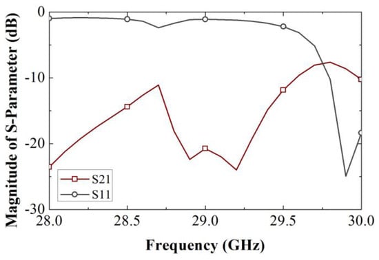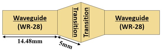 Before designing the whole RIS array, it is important to characterize the performance of the unit cells. It helps reduce the initial fabrication errors. Thus, before fabricating the whole RIS, we took a 1 × 3-unit cell array, and we wanted to check its performance in the waveguide environment and measure the amount of sensing from the sensing port of the unit cell. To characterize the unit cell and verify its performance with the waveguide, we chose the WR-28 waveguide, which can operate from 26.5 GHz to 40 GHz. The size of our unit cell was 5 mm × 5 mm. However, the size of the aperture of the said waveguide was 7.112 mm × 3.556 mm. Therefore, with this aperture size, it was not possible to fit the single unit cell on the waveguide aperture. Hence, to overcome this problem, we designed rectangular transition sections and we took a 1 × 3-unit cell array for the aperture of the proposed rectangular transition section. To verify the performance of the waveguide with transition sections, we took two waveguides and two transition sections together, as shown in Figure 8. Figure 9 shows the magnitude of the reflection and transmission coefficients with the said configuration of waveguides and the transition sections. It can be observed from Figure 9 that the magnitude of reflection coefficients remained below −23 dB within the 24.5–35 GHz frequency range. At 29 GHz, the magnitudes of transmission and reflection coefficients were −0.011 dB and −25.6 dB, respectively.
