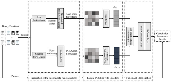 Rosenblum et al.’s groundbreaking study [14] introduced this methodology by defining a series of instruction idioms with placeholders to identify compiler-specific patterns through mutual information analysis, successfully determining compiler families with high accuracy. However, the method’s efficacy in identifying optimization levels remains unknown due to a lack of evaluation. The subsequent ORIGIN [3] work improved upon this by incorporating graphlets to capture structural features of the code, enhancing accuracy in compilation detail recovery. Hidden Markov models have also been employed to distinguish between compilers based on instruction type and frequency, necessitating distinct models for each compiler family without addressing optimization level identification [21,22]. BinComp [15] introduced a stratified technique for more resource-efficient compiler identification, but its focus on compiler-related functions limits its applicability to the broader challenge of function-level compilation provenance identification. Generally, the accuracy of these conventional machine learning methods heavily depends on the feature extraction and selection strategies carefully chosen based on expert experience, thus often introducing human bias and potentially missing relevant features.