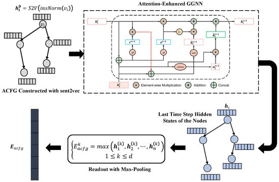 where denotes the final time step hidden states of a node v in the ACFG. Figure 2 illustrates the whole process of obtaining the of the ACFG with our devised GGNN enhanced with an attention mechanism.