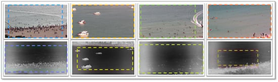 Image cutting and pairing. Due to the limited memory of GPUs, we crop the original images into sub-images with overlaps during training and inference. We resize images of different resolutions to the same size (i.e., 1920 × 1080 pixels) and cut out a series of 640 × 640 patches. For the non-registered multi-modal track, multi-modal images are input in pairs, and thus the cropped sub-images need to be paired one by one. Sub-images at the corresponding positions in the original multi-modal image pair are formed into a new image pair, and the new paired images can be fed into the multi-modal network. According to previous works [48,49,53,54], pure background images (i.e., images without objects) are not used for training. For an image pair, there may be a situation where one image has objects, and the other does not. In our experiment, we filter out the image pairs in this situation and keep the pairs that both contain objects.