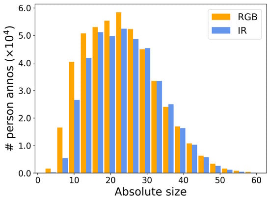 Tiny. Absolute size is defined as the number of pixels in the bounding box area, and relative size is the absolute size divided by the image pixels. As shown in Table 3 and Figure 2, the absolute size and relative size of persons in NRPerson are very small compared to other representative datasets [2,3,8,9,10,21]. Objects with small absolute scales are blurred and contain less semantic information, which increases the difficulty of the detector to identify the objects and greatly affects the performance [9]. Tiny relative scales result in the scenes having a large number of complex backgrounds, which exacerbates the issues of positive–negative imbalance and false positives, hence being more challenging and exploratory.