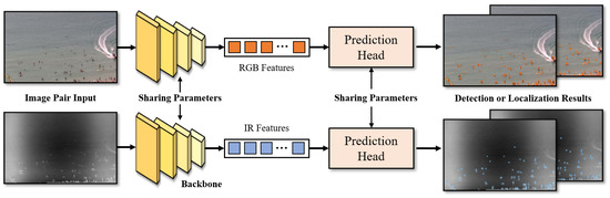 A flowchart of multi-modal model on the non-registered multi-modal track. Multi-modal image pairs are simultaneously input into the model to obtain detection or localization results for each modality. Orange represents RGB features and Blue represents the IR features.