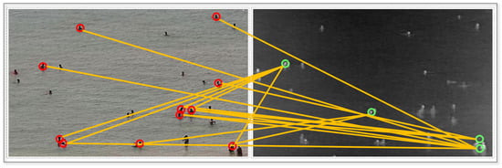 Figure 4. The poor feature-matching results suggest that, using our NRPerson dataset, it is difficult to achieve automatic registration.The red color represents the target in the visible image, the green color represents the target in the infrared image, and the yellow line indicates the matching between the two. - (3)