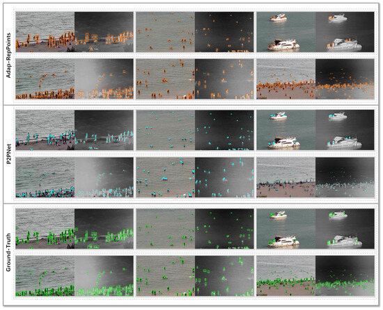 Some qualitative results of multi-modal baselines on the non-registered multi-modal track. The first two rows are the detection results of Adap-RepPoints (orange); the middle two rows are the localization results of P2PNet with CPR (blue); and the last two rows are the ground-truth (green). For better visualization results, we zoom in on the original images and capture the sub-images in which each pair has a roughly consistent field of view.