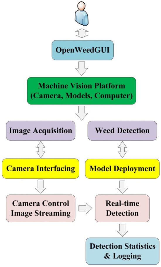Graphical user interfaces (GUIs) are software tools or applications that enable users to interact with hardware, data, and models, which are important for prototyping and the evaluation of machine vision systems in precision agriculture []. GUIs can provide a user-friendly interface that allows individuals, such as researchers, developers, and end-users, to easily access and utilize machine vision tools []. Particularly, in weed recognition, GUIs bridge the gaps between curated image datasets and machine learning models and offer the ease of deploying and evaluating models (trained offline) for real-time application. Making GUIs publicly accessible, in addition to datasets and models, would be significantly beneficial for stimulating collective and community efforts for repaid development iterations and progress, allowing developers to focus on solving other challenging tasks []. Although dedicated efforts have been made as described above to develop dedicated datasets and models to power machine vision systems for weed management, there have been comparatively scarce efforts directed at the development of open-source GUI tools for weed imaging and recognition. The lack of such tools hurts further progress in advancing the development of machine vision-based and AI-powered weeding technology.