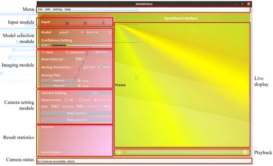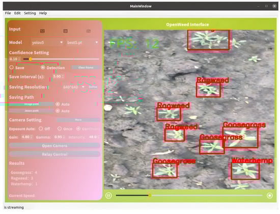 The OpenWeedGUI was developed using Python 3.8 in the Ubuntu 22.04.2 operating system, employing the PyQt5 toolkit for its user interface design. As a pythonic wrapper of Qt (C++), PyQt5 takes advantage of the former for GUI design while enabling extensive Python libraries for computer vision and deep learning tasks. In the framework of Qt, camera interfacing was achieved by the Vimba Python API (version 1.2.1) (https://github.com/alliedvision/VimbaPython, assessed on 20 June 2023) (Allied Version, Stadtroda, Germany) and downstream image and video processing tasks were undertaken by OpenCV (version 4.7.0). In conjunction with OpenCV, PyTorch (version 1.14) was used for deploying already trained YOLO object detection models for weed detection. Particularly for YOLOv5 models, TensorRT (version 7.x) (https://github.com/wang-xinyu/tensorrtx, assessed on 5 September 2023) and PyCUDA (https://github.com/inducer/pycuda, assessed on 5 September 2023) were used for accelerating real-time inference of YOLOv5 models, which is desirable for weeding systems with resource-constrained computing devices. The software programs for OpenWeedGUI will be made publicly available.