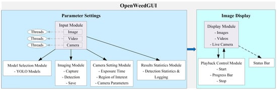 Figure 3 shows the framework of OpenWeedGUI, delineating the methodical interrelation between different functional modules. There are three distinct working threads, each of which is responsible for one of three input sources: images, videos, and camera livestreams. When an input option is checked (Figure 2), the corresponding thread is activated, enabling various downstream operational adjustments. For instance, with the camera option selected, upon a change in camera parameters made by the user, the GUI, driven by the active thread, instantaneously adjusts the imaging module’s operations, ensuring that the detection output immediately reflects the parameter modifications. The input module interfaces with the model selection module and allows the user to choose one among a variety of YOLO models, which will be subsequently fed into the imaging module, coordinating pivotal operations such as image acquisition and weed detection. The imaging operations are responsive to camera parameters, and the feedback from these processes subsequently prompts adjustments to the camera settings. The results statistics module prints a summary of weed detection results in real-time. The display module provides a live display of different types of image data input, which are internally linked to the playback module in case of playing an external video. The status bar conveys the real-time camera interfacing status.