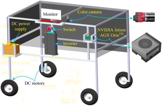 A lightweight mobile machine vision platform was designed and prototyped for the implementation and testing of OpenWeedGUI. As schematically shown in Figure 4, the platform mainly consists of a color camera (Allied Vision, Stadtroda, Germany) with a resolution of 2465 × 2056 pixels, attached with an 8.5-mm focus lens, and a Jetson AGX Orin developer kit (NVIDIA, Santa Clara, CA, USA) connected with supporting peripherals (monitor and keyboard), which are mounted with a wheeled, motorized frame. The platform was powered by a 12 V battery, which was connected to an inverter to power the computer and monitor. The Jetson kit, with 2048-core Ampere architecture and 64 Tensor Cores, is an advanced, energy-efficient system-on-a-chip edge computer designed for AI applications. The mobile platform was deployed for weed imagery in field conditions and the evaluation of onboard weed detection with the aid of OpenWeedGUI.