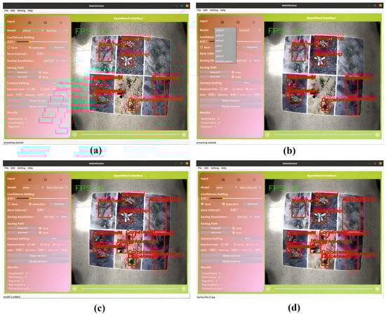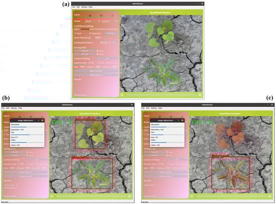 Figure 7 shows the outcomes of video detection, wherein users can play the video to dynamically observe detection results. Furthermore, Figure 8 demonstrates weed detection given a single image input. Here, users can import an image and initiate the detection process by enabling the detection checkbox. The GUI accommodates real-time adjustments of the hue, saturation, and value of a color image, as shown in Figure 8b,c, where image manipulation in a color space yields different detection results. It is noted that the GUI supports enabling saving operations on demand during video and image detection processes, allowing for the flexibility to capture images as needed.