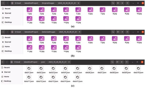 Illustration of saving operations by OpenWeedGUI in three separate folders. (a) Original images; (b) detected images with bounding boxes; (c) corresponding detection files (in .json format).