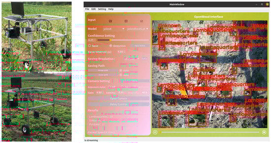 To further verify its operational functionalities, OpenWeedGUI was deployed on the mobile vision platform for in-field weed imaging and detection. Field tests were conducted throughout June and September of 2023 on the farmland of Michigan State University Horticulture Teaching and Research Center (Hort, MI). The field site was infested with naturally germinated weeds, among which Common Lambsquarters (Chenopodium album L.) was the dominant species. Since the weed was not included in the CottonWeedDet12 dataset for YOLO modeling [], separate weed imagery was curated to update YOLO models to detect the weed, which was trained using default hyperparameter settings on a dataset consisting of 1439 images with 12,107 bounding box annotations for Common Lambsquarters. Before running the mobile platform in field test events, the camera parameters were adjusted to accommodate field light conditions and kept unchanged during the test. The mobile platform was operated at a traveling speed of approximately 0.35 m/s. Figure 9 (left) shows a typical field test scenario, and Figure 9 (right) shows weed detection with YOLOv8s enabled in OpenWeedGUI. Readers are referred to a video clip (https://youtu.be/KK36A4SWhH0, assessed on 15 December 2023) on the dynamic process of weed detection by OpenWeedGUI on a field test occasion. The field tests confirmed the capabilities of OpenWeedGUI for weed imaging and detection.