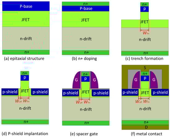 For the Trench-MOS and the Asym-MOS, the fabrication technologies are well-established. For the proposed Fin-MOS, the fabrication process is shown in Figure 2. As shown in Figure 2a, the epitaxial structure consists of the n+ substrate, a 10.8 μm n-drift region with a doping concentration of 8 × 1015 cm−3, and a 1.8 μm n-type JFET region (in this region, while the p-type shielding regions on both sides and the n-type region in the middle form a structure similar to the Junction Field-Effect Transistor (hence the name JFET region), with a doping concentration of NJFET, and, at the top, is a 0.7 μm p-type layer with a doping concentration of NPB used as the base region. The device fabrication commented with multiple nitrogen implantations to form the n+ source region as shown in Figure 2b. Then, the inductively coupled plasma reactive ion etching (RIE) is used to form the gate trench, as illustrated in Figure 2c. Then, multiple implantations are utilized to form the p+ shield region, as shown in Figure 2d. The self-aligned process is recommended to simplify the fabrication process. The offset distance between the p-shield and trench corner (Woff) is 0.2 μm. As shown in Figure 2e, Spacer-gate technology can be used to form the gates. The final process included the deposition of the gate oxide and the metal overlay process, which are shown in Figure 2f.