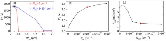 Figure 3a presents the influence of Wfin upon BV in the proposed Fin-MOS. For the conventional SiC MOSFET, the p-base typically has a doping level of ~1017 cm−3. Using a narrow fin-structure, junction-less MOSFETs without p-base doping (NPB) are proven to be possible [34,35]. However, for NPB = 0 cm−3, BV is very sensitive to Wfin, and drops quickly at a relatively small Wfin because the p-base is easily punched through. With NPB = 1017 cm−3, BV is more robust, and drops more gently with Wfin. In this work, Wfin = 0.2 μm is adopted for a robust BV.