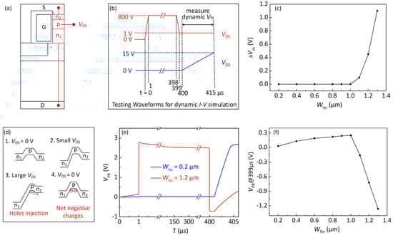 The above analysis can be further reflected and proven by the changes in the voltage of the floating p-region (VPB). Figure 5e shows the simulated waveforms of VPB of two devices with Wfin = 1.2 μm and 0.2 μm. When Wfin = 1.2 μm, VPB rises to 2.8 V as VDS is swept from 0 V to 800 V, which turns on the p-n junction; therefore, holes are injected out of the p-base. After the drain pulse, VPB drop to −0.72 V, which proves the storage of net negative charges in the p-base. However, the charge storage effect is not observed for the device with Wfin = 0.2 μm, since the p-base is well-shielded. Figure 5f plots VPB at 399 μs (immediately after drain pulse) as a function of Wfin. When Wfin is larger than 1 μm, VPB becomes negative. The result agrees with Figure 5c. Therefore, for the Fin-MOS with Wfin = 0.2 μm, the charge storage effect and the consequent dynamic threshold voltage shift are negligible.