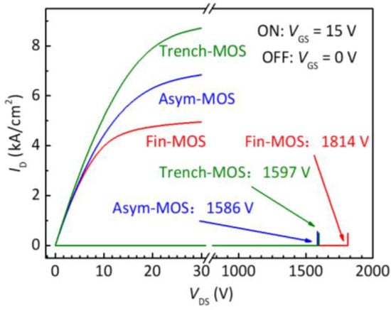 Figure 6 shows the I–V characteristics of the three SiC MOSFETs. The Trench-MOS boasts the lowest RON of 1.61 mΩ·cm2 because of the high channel density. The Asym-MOS has a much lower channel density than the Trench-MOS, and it still has a low RON of 1.72 mΩ·cm2 because of the high channel mobility of 40 cm2/V-s being adopted. Though a low channel mobility of 20 cm2/V-s is being adopted, the Fin-MOS has a low RON of 1.71 mΩ·cm2, owing to the high channel density. The slight increase in RON compared to the Trench-MOS is caused by the JFET resistance when the current passes though the aperture between p-shields. All the studied MOSFETs present a breakdown voltage beyond 1500 V. The Fin-MOS boasts the highest breakdown voltage because the distances beyond p-shield regions are reduced, which smooths the electric field distribution. Furthermore, though with a higher channel density than the Asym-MOS, the saturation current of the Fin-MOS is the lowest among the three, as a result of its narrow JFET region.