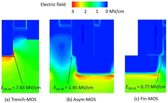The OFF-state electric field distributions at VDS = 1200 V in a half-cell of (a) the Trench-MOS, a cell of (b) the Asym-MOS, and a half cell of (c) the Fin-MOS.