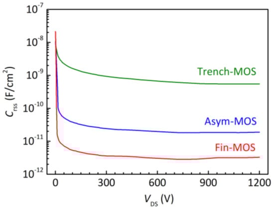 Reverse transfer capacitance (Crss) is one of the important dynamic characteristics of the power devices [39,40]. Figure 8 shows the Crss of the three SiC MOSFETs. The Trench-MOS suffers the largest Crss. For the Asym-MOS, the p-shield regions provide a shield to the gate, resulting in a lower Crss. For the proposed Fin-MOS with Wfin = 0.2 μm, the p-shield provides the strongest shield to the gate, leading to the lowest Crss among the studied MOSFETs.