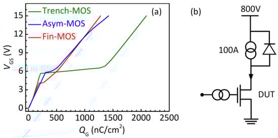 (a) VGS–QG curves of the studied MOSFETs. (b) The test circuit for the gate charge characteristics. For the Trench-MOS, QG = 2093 nC/cm2 and QGD = 1063 nC/cm2, for the Asym-MOS, QG = 1424 nC/cm2 and QGD = 107 nC/cm2, while, for the Fin-MOS, QG = 1282 nC/cm2 and QGD = 62 nC/cm2.