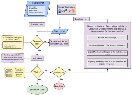 Upon receiving the expected response, the progression involves code simulation and testing, which means running the function for different cases and getting the expected result. The conversation concludes when the code functions as intended. However, in cases of code malfunction, the subsequent step entails the crafting of a new prompt incorporating error messages, heightened specificity, illustrative examples, or details regarding required code modifications, e.g., if the code does not work due to a data type error, it communicates so to the AI. After multiple iterations, when the LLM consistently produces similarly incorrect responses, it indicates the need to commence a new chat session.