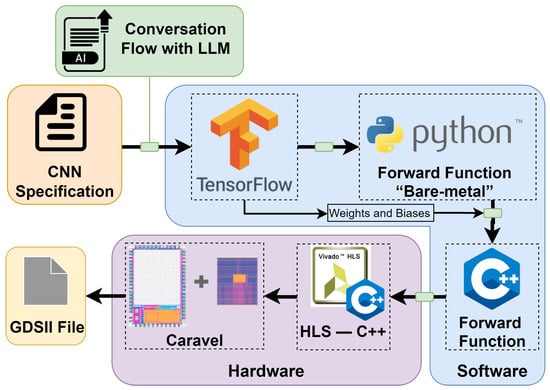 Workflow for the development of a CNN using LLM, from TF architecture to GDSII throughout Caravel integration.