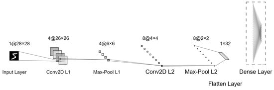 The approach taken involved implementing a compact network using the following layers 4 × 3 × 3 Conv2D, 4 × 4 MaxPool, 8 × 3 × 3 Conv2D, 2 × 2 MaxPool, flatten, and finally, the dense layer, as well as the use of half-precision floating-point format to optimize resource usage. Figure 5 illustrates the CNN created.
