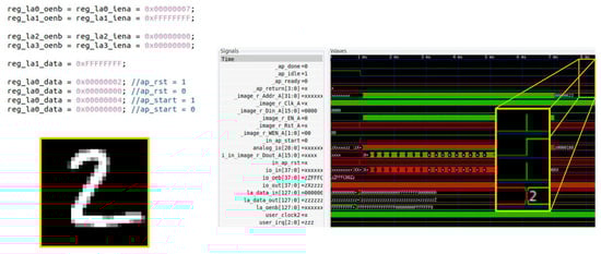 Figure 7 illustrates the SoC testbench, the image stored in memory, and the C++ code programmed in the RISC-V processor. The figure depicts the processor’s handling of reset signals, start processes, the waiting period for the done signal, and the resulting inference values. After 1000 iterations, the system yields the same results as the HLS test, with an accuracy of 98%, proving that it works as intended.