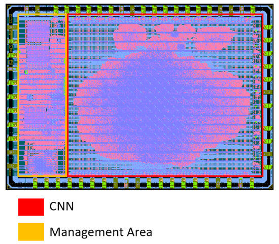 The outcome of the RTL to GDSII conversion process, along with its integration with the RISC-V made with Caravel, is visually presented in Figure 8. It illustrates two distinct areas: the user area, representing a flat implementation of the CNN, and the management area, housing the processor and its associated peripherals.