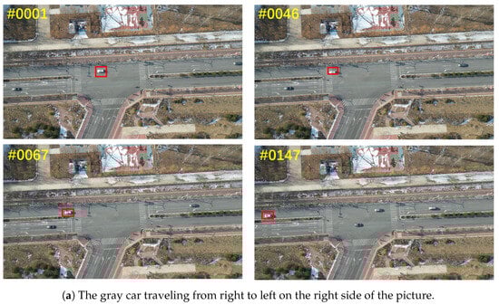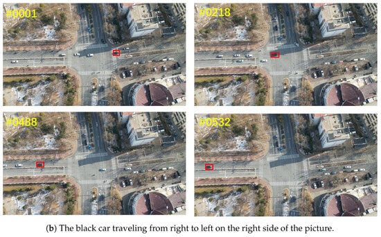 The UAVDT data set comprises 6 h of original video material, from which 2000 video sequences are extracted, totaling approximately 900,000 frames. The number of frames per video sequence ranges from 117 to 1461. The construction of the data set involved two main steps. First, 280 video sequences were selected from existing UAV tracking data sets, including UAV123 [15], UAVDT [14], and VisDrone2019-SOT [16], which already provide tracking data based on bounding boxes. To these sequences, we added natural language descriptions of the tracking targets to enrich the UAV data sets. Second, an additional 1720 video sequences were collected through UAV filming over traffic arteries in various cities. All videos were shot and recorded at 30 frames per second (fps) with a resolution of 3840 × 2160 (4K), ensuring high image clarity.