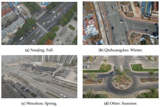 The figures illustrate the diversity of video data in our data set, captured across different cities and seasons. Sub-figures (a–c) showcase video data from Nanjing in fall, Qinhuangdao in winter, and Wenzhou in spring, respectively. Sub-figure (d) represents additional video data acquired from UAV123 [15].