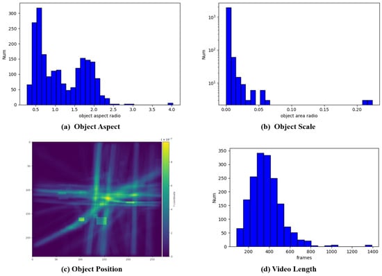 - Object position: As shown in Figure 3c, the heatmap illustrates the spatial distribution of target bounding boxes within video frames. The bright areas indicate locations with a high frequency of target appearances. The primary directions of target movement are either upwards, downwards, left, or right, a characteristic that indicates our data set was mainly captured in areas such as intersections and other traffic hubs, capturing typical movement patterns within these regions.