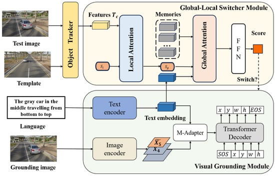 The overall framework of our method. It contains three modules: (1) The visual grounding module, which locates the target based on natural language descriptions. For the first frame of the video, the visual grounding module locates the target and crops it to serve as a template. (2) The object tracker, which utilizes the template to perform tracking on subsequent images. (3) The global–local switcher module evaluates the tracking results by integrating spatio-temporal and linguistic features to assign a score. Moreover, based on the score, it chooses whether to switch modules.