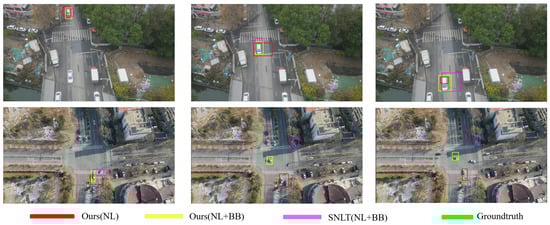 Furthermore, to qualitatively demonstrate the efficacy of our proposed method, we provide visual comparisons of the UAVNLT data set as shown in Figure 6. In the visualizations, in the simpler scenario depicted in the first row, our methods based on NL or NL+BB achieve good results, accurately locating the moving white vehicle. The second row shows a more complex scenario. In this scenario, the method based solely on NL exhibits some inaccuracies. However, our approach of integrating NL with BB still precisely locates the target.