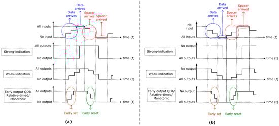 Figure 2a,b show representative input–output timing relations in strong indication, weak indication, and early output QDI/relative-timed/monotonic circuits according to R0H and R1H, respectively. The arrival of data is highlighted by the dotted blue circles and ovals, and the arrival of the spacer is highlighted by the dotted red circles and ovals. The early set and reset phenomena are highlighted by dotted brown and green ovals. Some of the gates used in an IOM asynchronous circuit may exhibit the early set property while some of the gates may exhibit the early reset property. For example, an OR gate exhibits an early set and this is because it can output 1 even if one of its inputs assumes 1; and an AND gate exhibits an early reset and this is because it can output 0 even if one of its inputs assumes 0. On the contrary, the inverter and the Muller C-element do not exhibit early set or reset property—this is because both these gates require all the input(s) to effect a change in their output. Concerning the OFA and the TFA, to be discussed in this paper, some of those are strongly indicating while the rest are weakly indicating or early output type which includes early output QDI and monotonic types. In early output OFAs and TFAs, the early reset (set) property is manifested for the spacer processing in the case of R0H (R1H).
