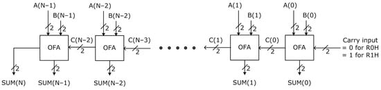 An N-bit RCA can be realized using (N/2) TFAs instead of N OFAs, where N is even, as shown in Figure 4. Thus, the number of addition stages is halved in an RCA comprising TFAs compared to an RCA consisting of OFAs.
