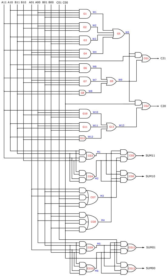 Based on Figure 5, we shall discuss the operation of the proposed TFA with respect to R0H here. It would not be difficult to comprehend the TFA operation with respect to R1H and so this is left to the reader’s interest. To aid with the explanation of the proposed TFA operation, in Figure 5, the simple gates are marked with labels G1 to G13 in red, and the complex gates are marked with labels CG1 to CG12 in red. W1 to W13 and M1 to M6 highlighted in blue signify the internal/intermediate TFA outputs.