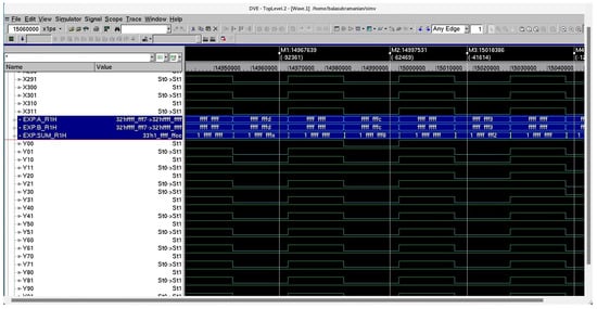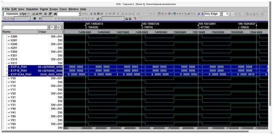 Figure 7 depicts a 32-bit addition in hexadecimal format, corresponding to R1H. A_R1H represents a 32-bit input bus containing dual-rail encoded input rails (X310, X300, X290, …, X00), while B_R1H denotes another 32-bit input bus consisting of dual-rail encoded input rails (Y310, Y300, Y290, …, Y00). SUM_R1H signifies the 33-bit sum bus comprising dual-rail encoded output rails (SUM320, SUM310, SUM300, …, SUM00). As observed in Figure 7, the one’s spacer is visible between two input data. Consequently, the spacer sum of (1 FFFF FFFF) is displayed between two other sums in the figure.