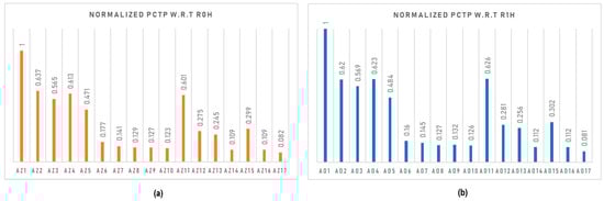 In IOM asynchronous circuits, the energy metric, a crucial measure for low-power design [], is derived from the product of power and cycle time. Minimizing power and cycle time are desirable. Hence, it is desirable to minimize the power-cycle time product (PCTP). The power and cycle time values given in Table 2 were multiplied and then normalized. The resulting normalized PCTP for asynchronous RCAs is illustrated in Figure 8a,b, corresponding to R0H and R1H, respectively. Normalization is achieved by dividing the actual PCTP of each RCA by the highest PCTP corresponding to an RCA for R0H and R1H separately.