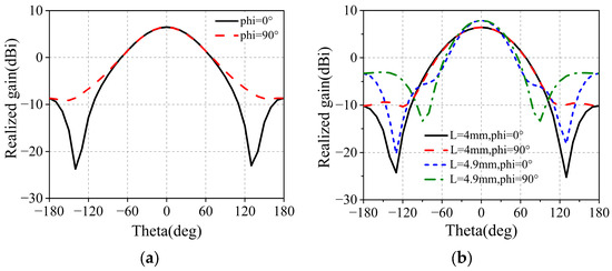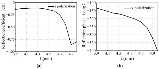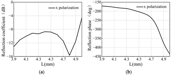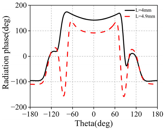 The overall unit simulation results for x-polarized and y-polarized incident waves are shown in Figure 5. For the x-polarized incident wave, when L varies from 4 mm to 4.9 mm, the reflection amplitude varies by 0.45 dB, and the phase shifts by 210°. Similarly, for the y-polarized incident wave, as L changes from 4 mm to 4.9 mm, the reflection amplitude differs by 0.45 dB, and the phase changes by 155°. Evidently, both the x-polarization and y-polarization of the antenna unit meet the RCS reduction condition, which requires a phase difference of 180° ± 37° and a relatively stable reflection amplitude within a certain range. Figure 6 demonstrates the simulation results of the radiation pattern. When the loaded phase control metasurface has a length L of 4 mm, compared to the microstrip patch antenna unit, there is no decrease in the gain of the designed antenna unit and the pattern hardly changes. When L is 4.9 mm, the main lobe of the designed unit narrows, but the gain increases by 1.44 dB.