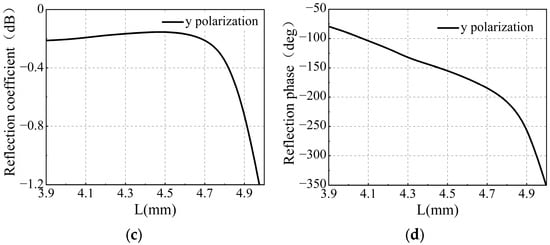 Simulation results. (a) x-polarization reflection coefficient; (b) x-polarization reflection phase; (c) y-polarization reflection coefficient; (d) y-polarization reflection phase.