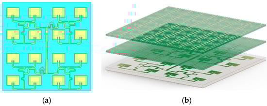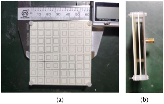 In order to ensure that the electromagnetic waves can be radiated normally through the metasurface when the antenna is working, a microstrip patch antenna unit at the same working frequency as the phase control metasurface is designed. The microstrip patch unit has a period of 1/2, whereas the phase control unit has a period of 1/4. The designed phase control unit is arranged in a 2 2 array configuration and mounted above the microstrip patch unit. The overall structure is shown in Figure 4. The microstrip antenna unit features a dielectric substrate made of Arlon Ad450, with parameters including a = 8.4 mm, b = 6.7 mm, and c = 2.9 mm.