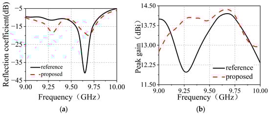 Designed antenna and reference antenna radiation performance. (a) Reflection coefficient; (b) peak gain.
