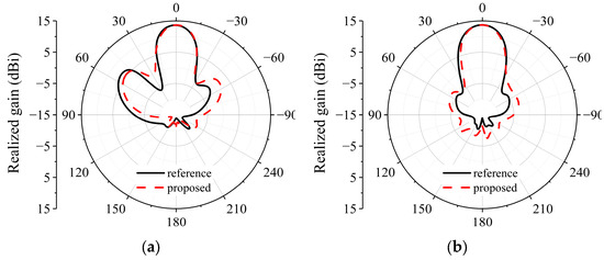 The antenna units of two sizes are arranged in a checkerboard pattern. A one-to-sixteen power divider with equal power and different phases is designed. The unequal-phase power divider can compensate for the radiation phases of the antenna units, ensuring that the radiation performance of the designed antenna remains unaffected. The reference array antenna and the designed antenna structures are depicted in Figure 7. The reference antenna measures the total size of 61 mm × 61 mm × 1 mm and distance between the antenna units of D = 4 mm, with other unchanged dimensions compared with the reference antenna. The bends indicated by red circles in Figure 7a serve to ensure unequal-phase feeding to the two types of phase-regulating metasurface modules. Figure 8 illustrates that the phase value is approximately 50° to compensate for the phase difference of the radiation waves for two antenna units. Figure 9 compares the simulation results of the designed and reference antennas. Upon loading the phase control metasurface, the patch array antenna still operates at 9.65 GHz, with the peak value remaining virtually unchanged or experiencing a slight increase. Figure 10 displays the radiation patterns of the designed and reference antennas operating at 9.65 GHz. Notably, the metasurface has minimal impact on the radiation pattern of the microstrip array antenna.