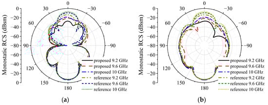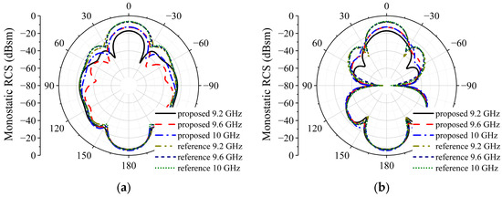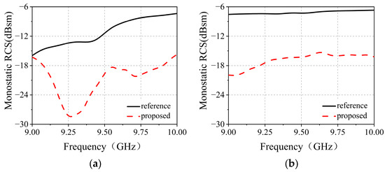 Monostatic RCS of the designed antenna and reference antenna. (a) x-polarization; (b) y-polarization.