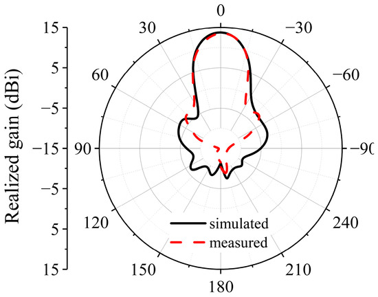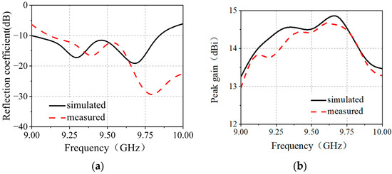 In order to verify the accuracy of the simulation results, the designed antenna was processed and tested, as shown in Figure 14. Figure 15 compares the simulation and test results of the designed low-RCS array antenna’s radiation performance. It can be seen from Figure 15a that there is a frequency offset between the test results and the simulation results. Figure 15b is the peak gain comparison chart. Compared with the simulation, the test results are reduced by 0.21 dB at the frequency point of 9.65 GHz. The deviation of the radiation performance is due to the fact that the metasurface and the patch antenna are separated by a gasket, and the air layer between them cannot be kept consistent with the simulation distance parameters, resulting in processing and assembly errors. Figure 16 depicts the measured and simulated radiation patterns, which align closely, validating the accuracy of the simulation results. The curves tend to be consistent, which verifies the accuracy of the simulation results. Table 1 gives a comprehensive comparison of the designed antennas and the antennas in the reference. By comparison, the antenna designed in this paper has the advantages of small size, large reduction value, and low loss.