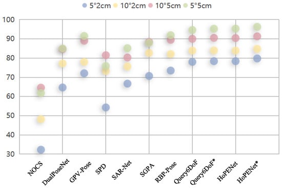 To build HoPENet, we employ the same data processing method as [8] and select PointNet++ to extract features. For the model training, we utilize the AdamW optimizer, set the initial learning rate to 1e-4, and the weight decay to 1e-4. The model undergoes training for a total of 100 epochs, with a batch size of 15 × 4. The model was trained and tested using the open-source PyTorch deep learning framework, and all experiments were conducted on a PC equipped with 4 NVIDIA GeForce RTX 3090 GPUs. For evaluation indicators, we adhere to the NOCS [9] evaluation scheme and utilize the mean Average Precision (mAP) and n°m cm under various intersection-over-union (IoU) thresholds as evaluation criteria. 3D IoU calculates the overlap between two 3D bounding boxes under predicted and ground truth poses. A prediction is deemed correct if the overlap ratio exceeds the fixed threshold. We use thresholds of 25, 50, and 75 for measurement, respectively. n°m represents the calculated rotation and translation error between predicted and ground truth poses. A prediction is deemed correct if both the rotation and translation errors are below the angle and distance thresholds. Four standards of 5°2 cm, 5°5 cm, 10°2 cm, and 10°5 cm are used, respectively.