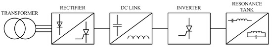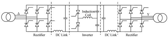 Induction heating furnaces operate based on eddy current losses in electrically conductive materials when exposed to varying magnetic fields. Induction furnaces (IFs) are characterized by efficiency, rapid heating, controllability, and cleanliness. Thus, they are widely used in industry for heating, melting, welding, or hardening metals. As shown in Figure 1, the power supply of an IF comprises four main parts: a rectifier, a DC link, an inverter, and a resonance tank [1]. The inverter topology could be a current source or voltage source feeding a parallel or series resonant circuit, respectively. In this work, the furnaces have voltage source-type series-resonant inverter configurations, as shown in Figure 2. The six-phase fully controlled rectifier consists of silicon-controlled rectifiers (SCRs) that facilitate the primary AC to DC conversion. The rectifier produces a fixed DC voltage and the SCRs are used for AC line interruption in the case of faults in circuits following the rectifier. The current limiting reactor is placed in series with the inverter to limit the inrush current during a short circuit and SCR faults. The DC capacitors filter the rectifier output voltage ripple and act as voltage sources for series resonance circuits. The furnace coil and series AC capacitors form a resonance circuit with a variable resonant frequency as the inductance varies depending on the charge state inside the power coil. When driving the series resonant load, there is always a phase shift between the output voltage and current except at the resonance frequency in an ideal state. Therefore, there are anti-parallel diodes with SCRs to bypass the current in this state. In order to regulate the power, the switching frequency is varied above or below the resonance. The circuit impedance of the tank circuit increases, and, consequently, the amount of power delivered to the coil decreases. The power of a furnace is automatically limited to regulate these parameters: the AC capacitor voltage, inverter current, inverter frequency, and furnace voltage. If either of these values exceeds its preset value, the inverter’s power is then automatically diminished by the inverter control board even if the power is set to maximum by the operator.