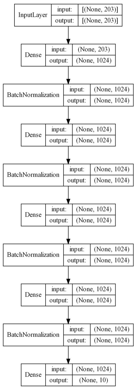 After data labeling, we use a deep neural network to train a model and diagnose fault samples in real time. For the DNN model buildup, we try to minimize the number of layers in order to decrease the computation time, while keeping acceptable prediction accuracy. We adopted the DNN method in this paper due to its effectiveness in real-time fault diagnosis, particularly in the vital and high-value contexts of induction furnaces in foundries. As shown in Figure 4, the proposed model is constructed based on five dense layers with batch normalization. This setting is based on extensive iterative experimentation. The Softmax function is employed for the classification tasks to predict the probability of different classes, and the categorical cross-entropy is utilized as the cost function for the model training. The cross-entropy for each sample, s, in multi-class classification can be defined as follows: